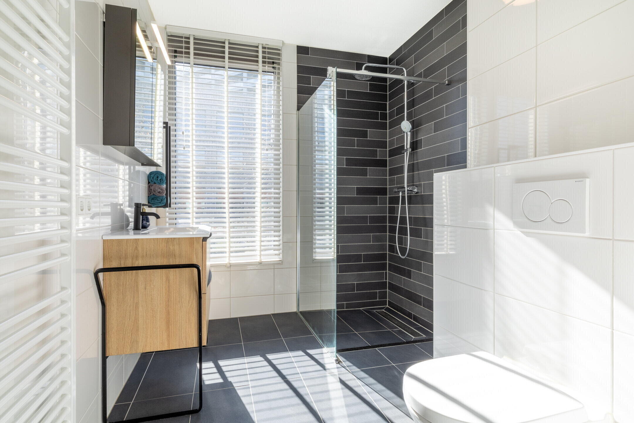 De badkamer (ca. 2.88 x 2.20m) beschikt over een royale inloopdouche met een glazen scherm, hand- en regendouche, een wandcloset met inbouwreservoir, een brede wastafel in meubel, designradiator en mechanische afzuiging. De badkamer is afgewerkt met een moderne donkere vloertegel en een lichte wandtegel.