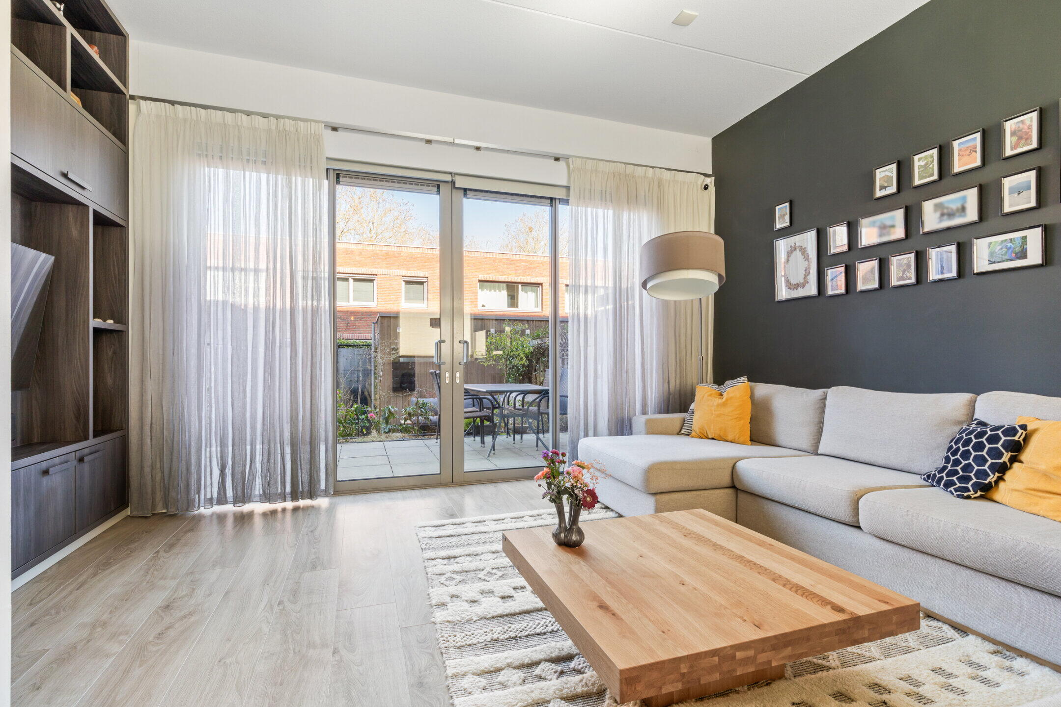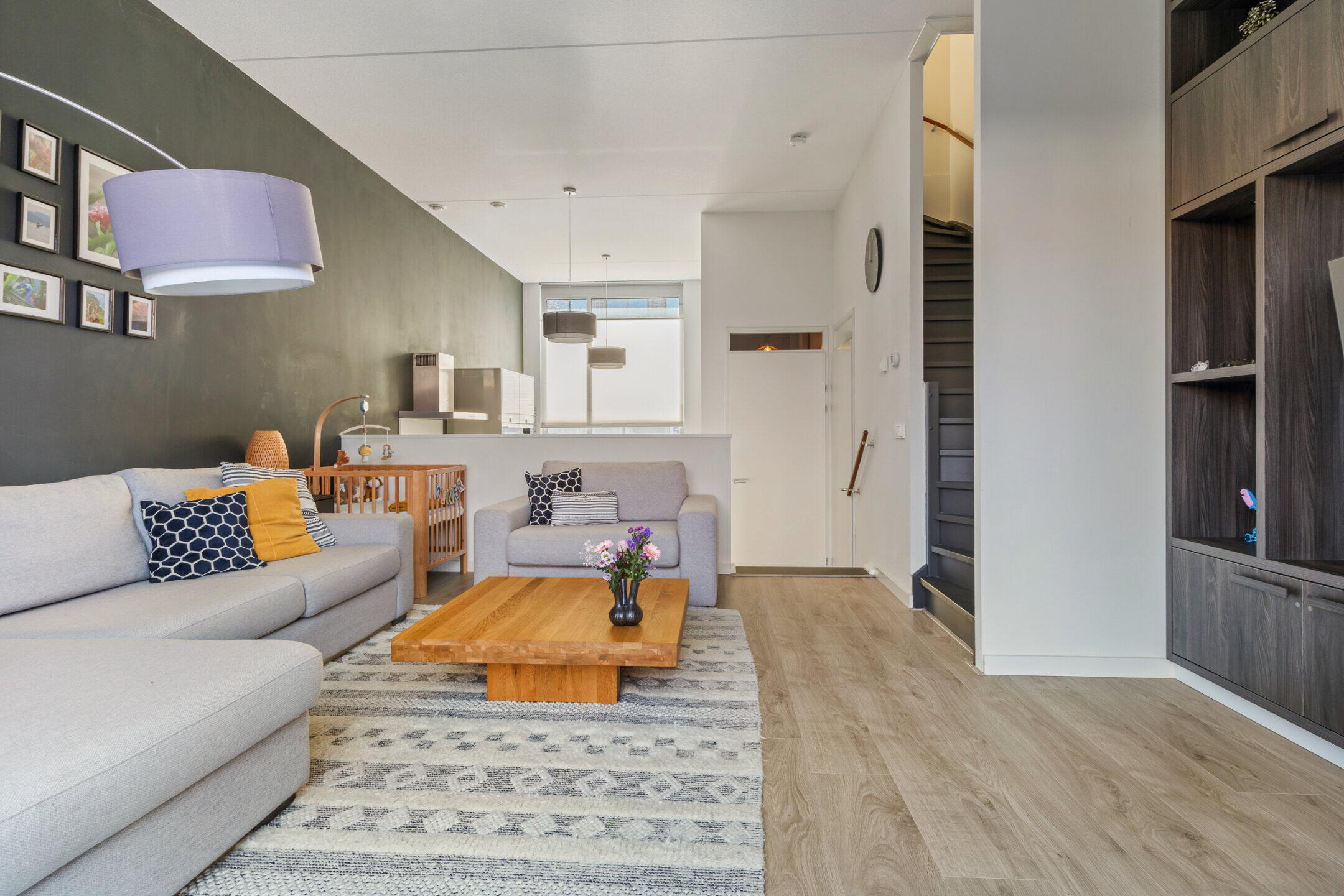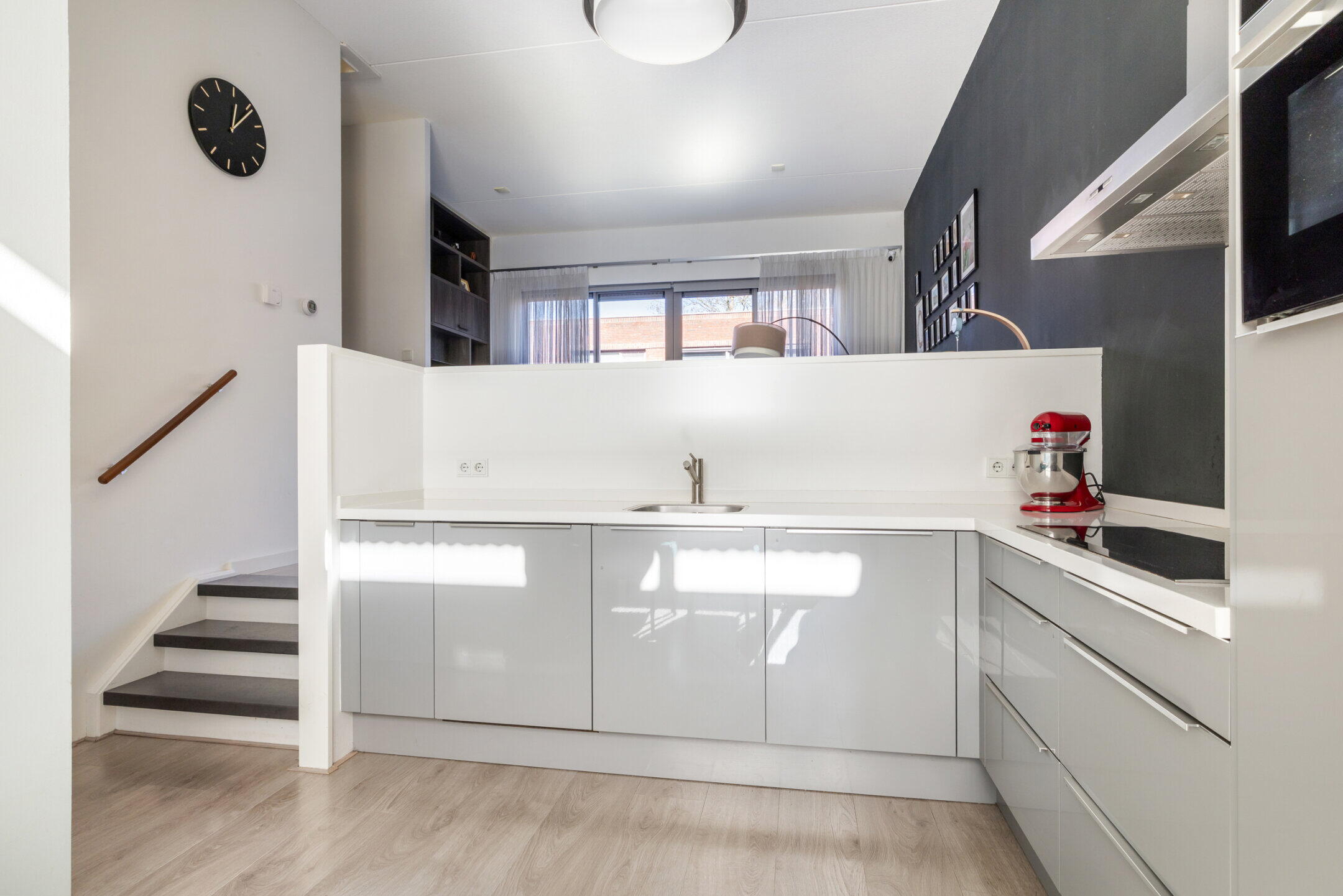 De woonkamer (ca. 5.10 x 4.70m) is voorzien van een nette laminaat vloerafwerking, vloerverwarming en kent een heerlijke lichtinval door de grote raampartijen. De open trapopgang in de woonkamer geeft toegang tot de eerste verdieping en middels een dubbele aluminium schuifpui is de stille achtertuin bereikbaar. Deze schuifpui kan in de zomer heerlijk open worden gezet waardoor je de tuin bij de woonkamer betrekt.