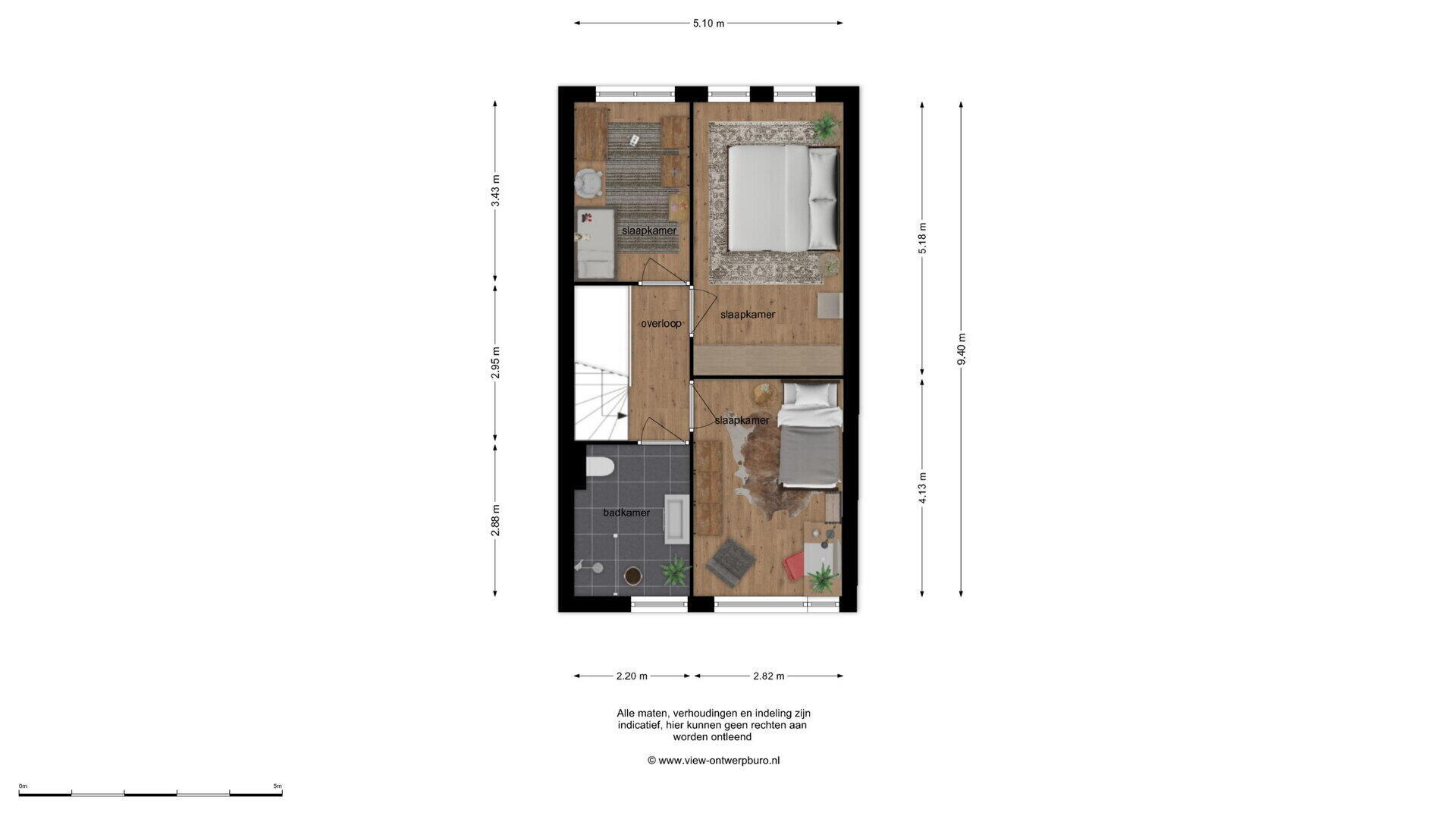 De overloop (ca. 2.95 x 2.20m) geeft toegang tot drie slaapkamers en de badkamer.