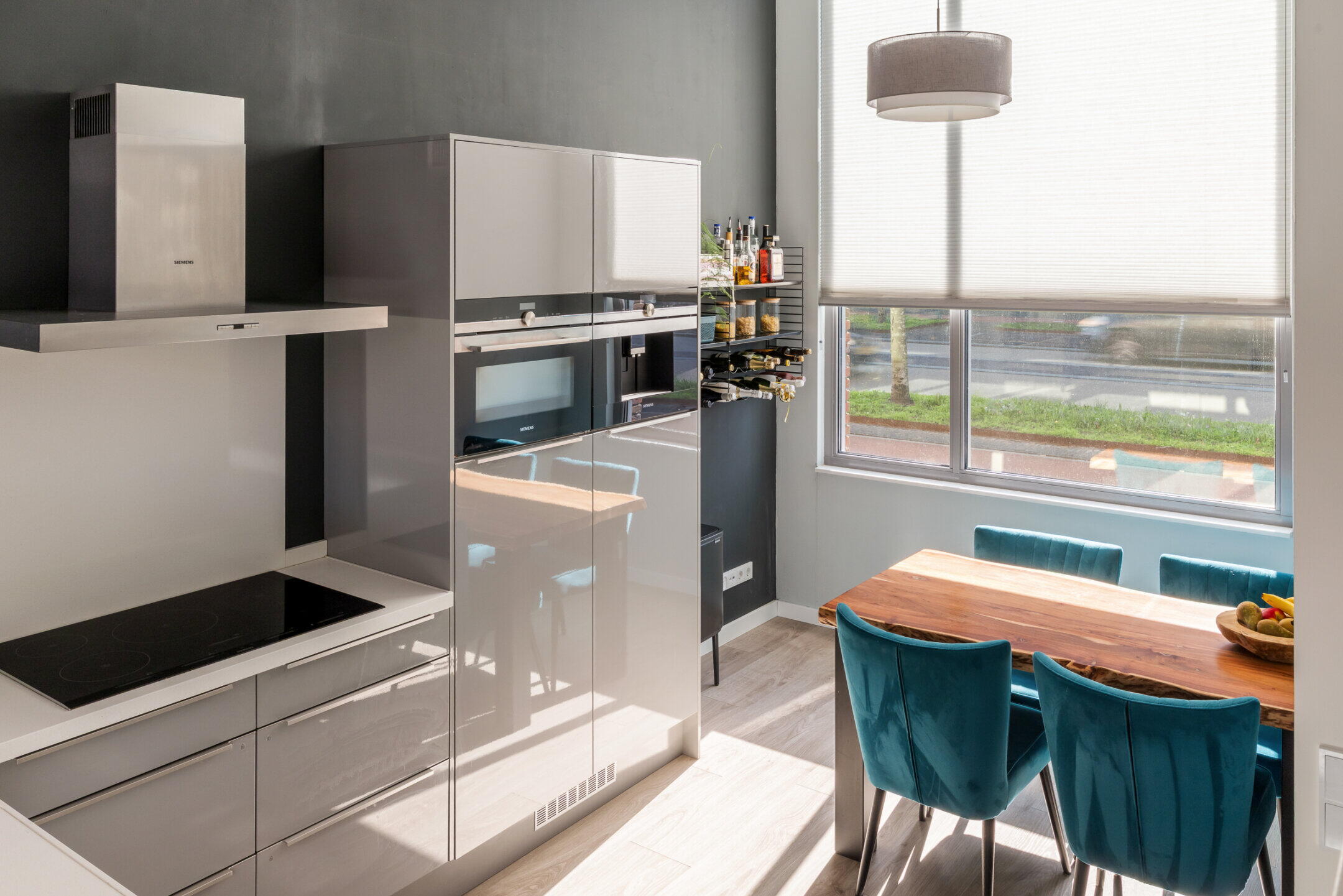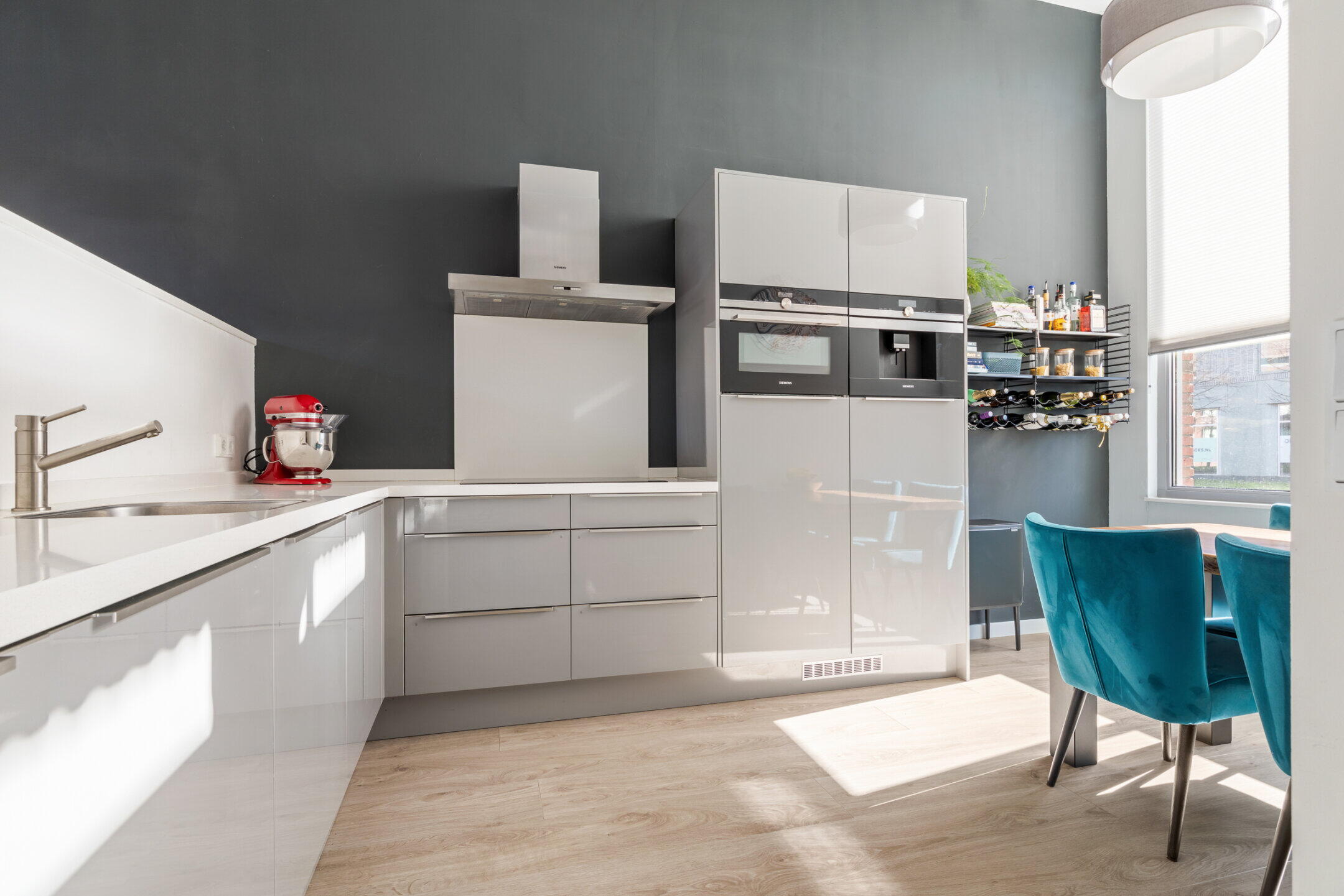 De luxe open keuken (ca. 4.62 x 2.68 m) in een hoekopstelling is voorzien van een composiet werkblad en diverse inbouwapparatuur waaronder een inductiekookplaat met flexzones, rvs afzuigkap, koffieapparaat, combi oven/magnetron, koelkast, vrieskast (4 laden), vaatwasser en een spoelbak. De keuken is afgewerkt met een nette laminaatvloer en voorzien van vloerverwarming en mechanische afzuiging.
