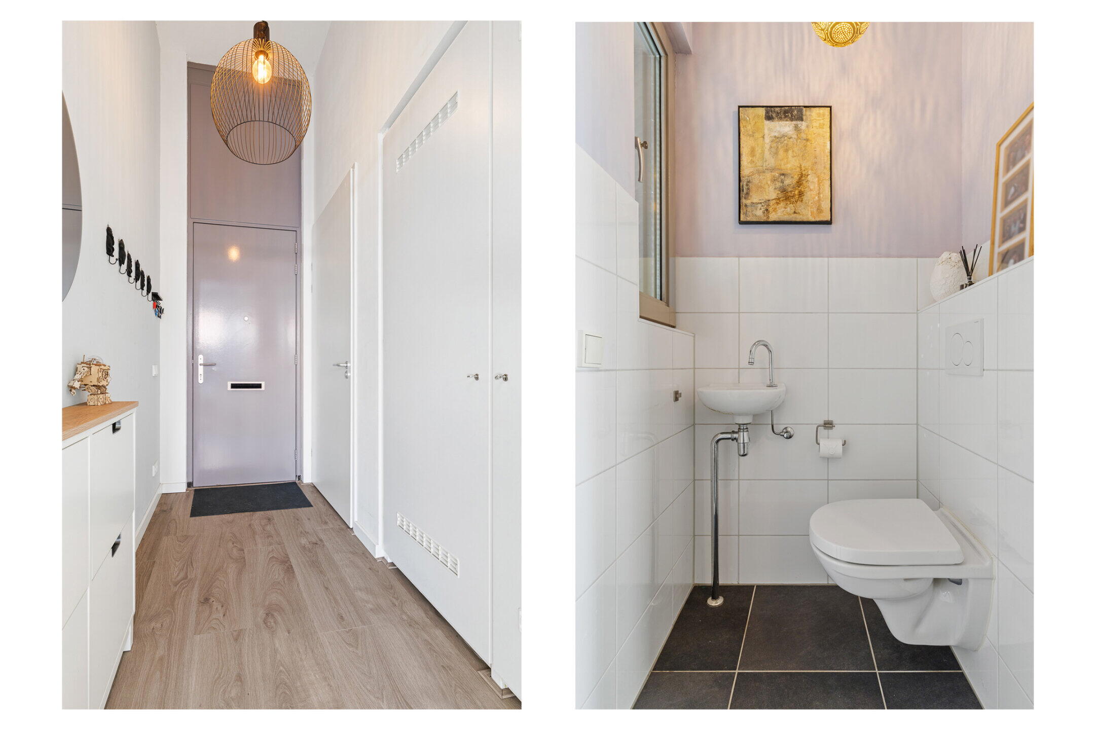 Entree/hal (ca. 2.88 x 2.35m) met de meterkast (9 groepen), een vaste kast met de c.v. combiketel en de halfbetegelde toiletruimte voorzien van een wandcloset met inbouwreservoir, fonteintje en mechanische afzuiging. Vanuit de hal is er toegang tot de keuken met open woonkamer.
